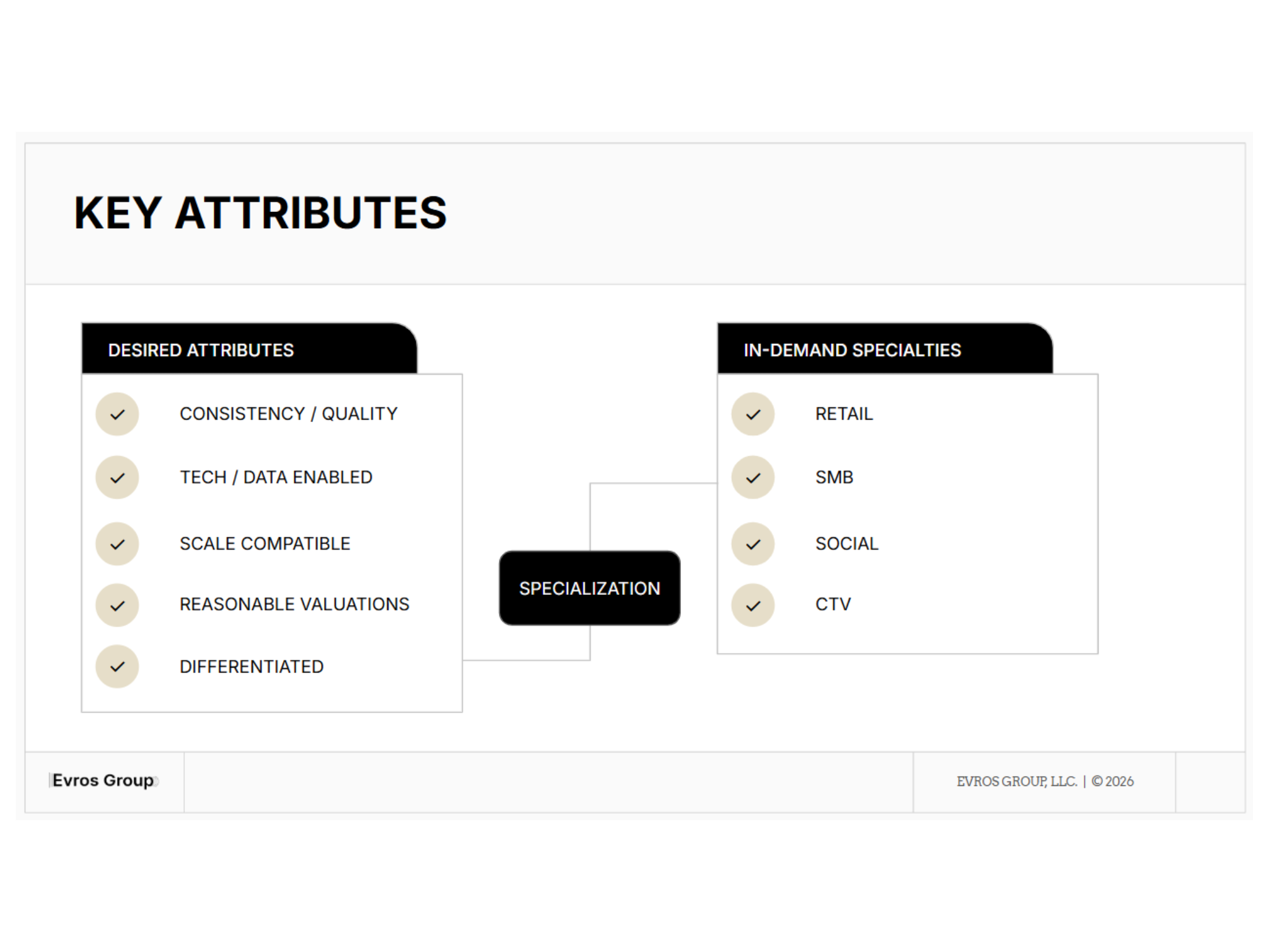 And this all comes with a practical takeaway. As an agency owner, you should consider whether one of your capabilities has the potential to stand out as a dominant specialty and give you a unique position in the market. Without casting other services aside, showing differentiation in a specialized category can act as a flywheel to unlock valuable leverage in any given transaction.